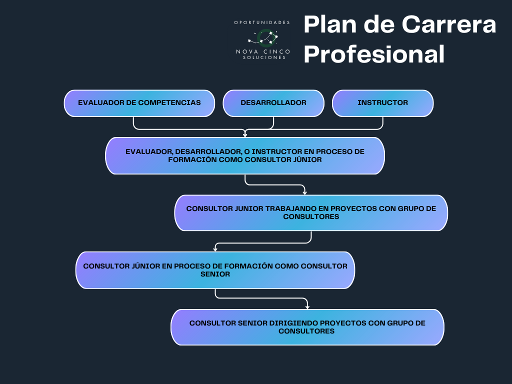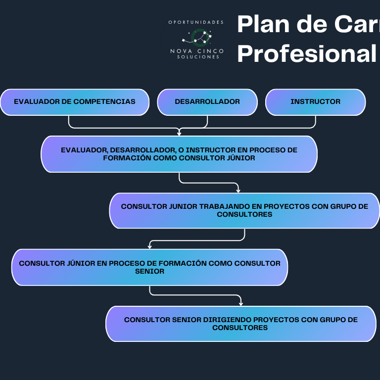 En Nova Cinco Soluciones ofrecemos un plan de carrera estructurado que permite a nuestros colaboradores avanzar desde niveles junior hasta senior, con certificaciones oficiales y mentoría continua. Cada etapa incluye capacitación, certificación en nuevos estándares y participación en proyectos de mayor impacto. Nuestro objetivo es que cada consultor se convierta en un referente en su área y crezca junto con la empresa.